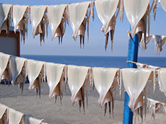 焼きイカ通りには、まるでカーテンのようにイカの生干し風景が見られます。