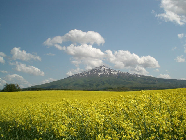 鰺ヶ沢町建石地区にある菜の花畑は、岩木山をバックに毎年5月頃に開花し、見頃を迎えます。